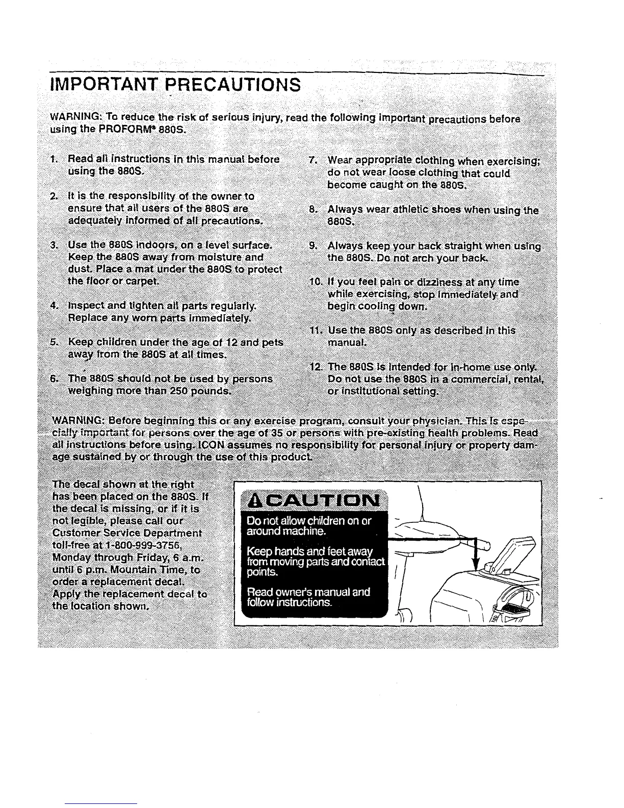 ProForm 880s - Important Precautions and Warnings; General Safety Guidelines; Specific Usage Warnings