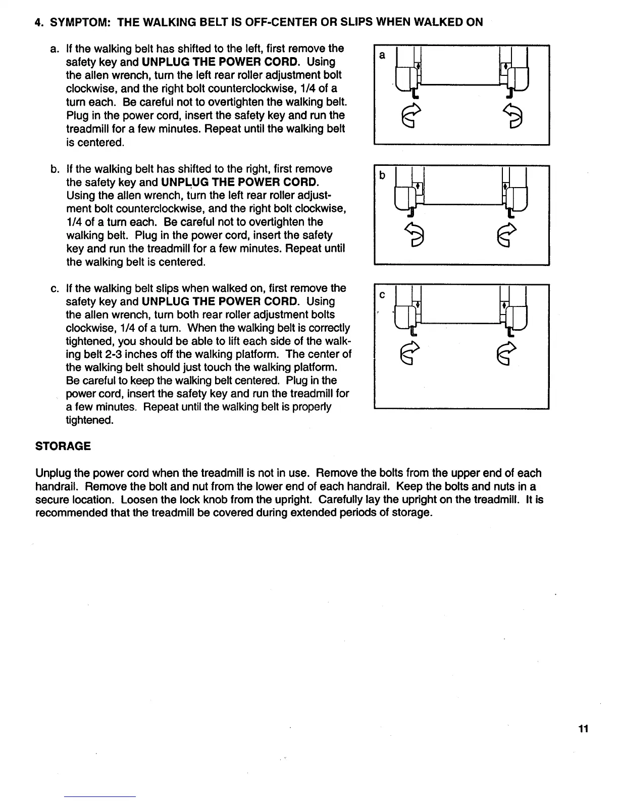 ProForm 910 - Belt Adjustment and Storage; Walking Belt Alignment and Tensioning; Treadmill Storage Guidelines