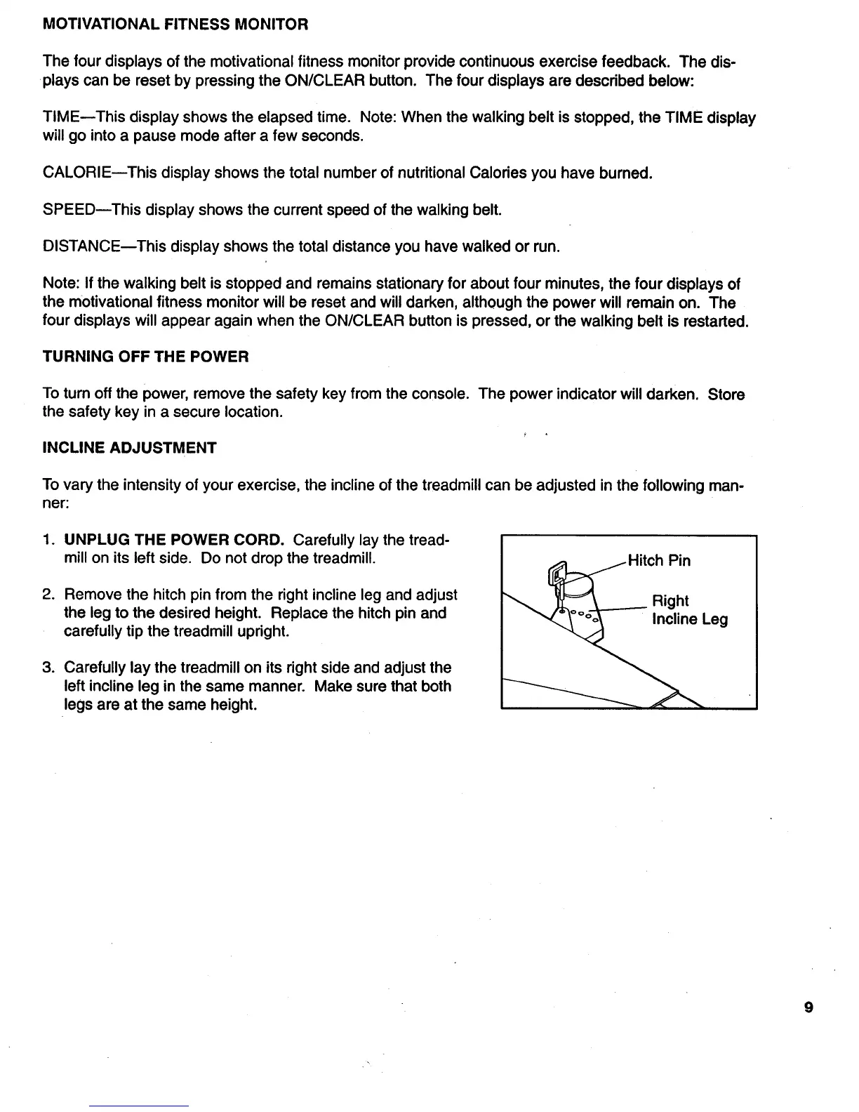 ProForm 910 - Workout Monitoring and Incline Adjustment; Motivational Fitness Monitor Functions; Turning Off Treadmill Power; Manual Incline Adjustment