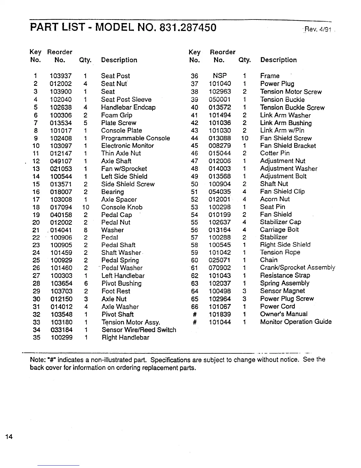 Note: "#" indicates a non-illustrated part. Specifications are subject to change without notice. See the