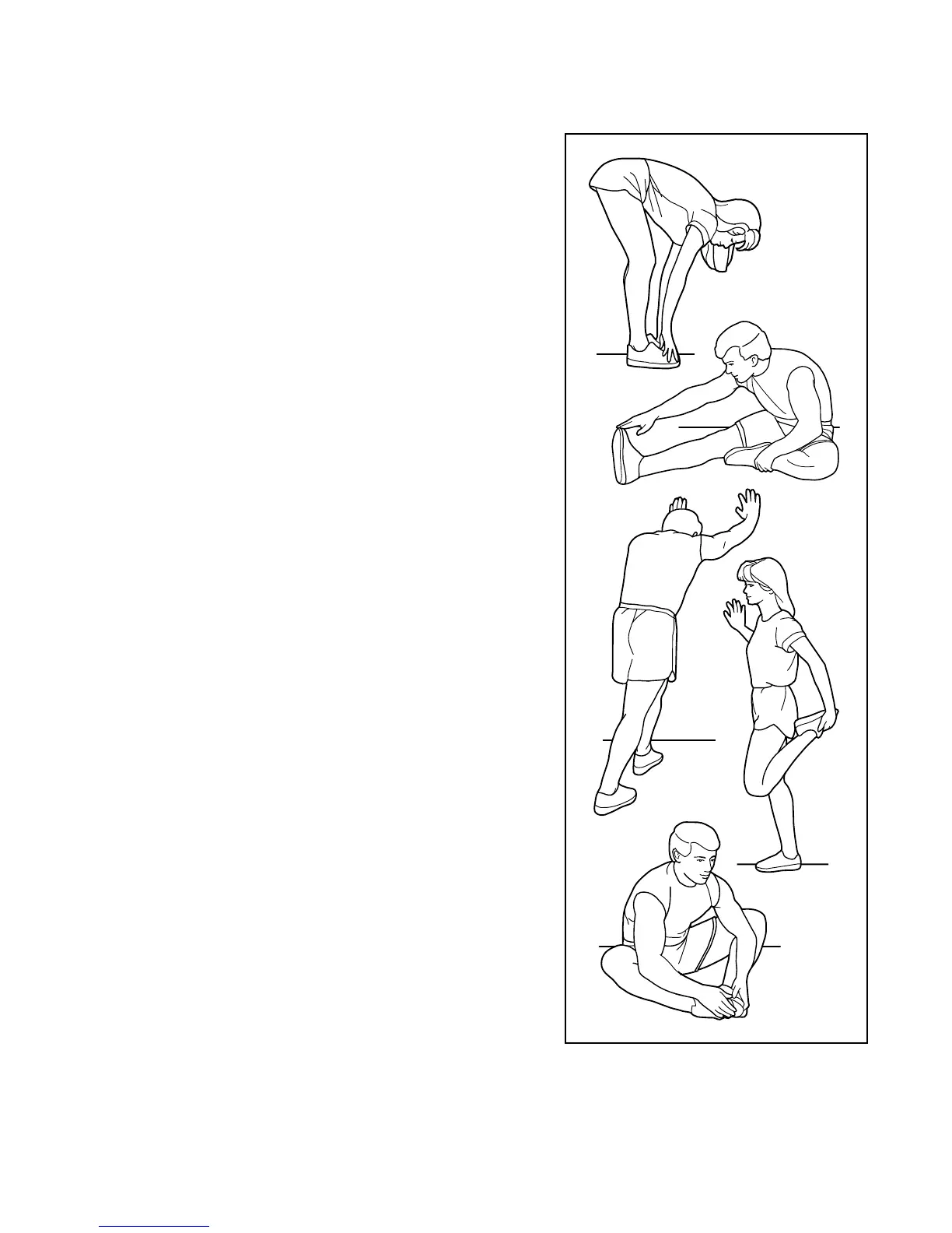 The correct form for several basic stretches is shown at the right. Move slowly as you stretch—never bounce.