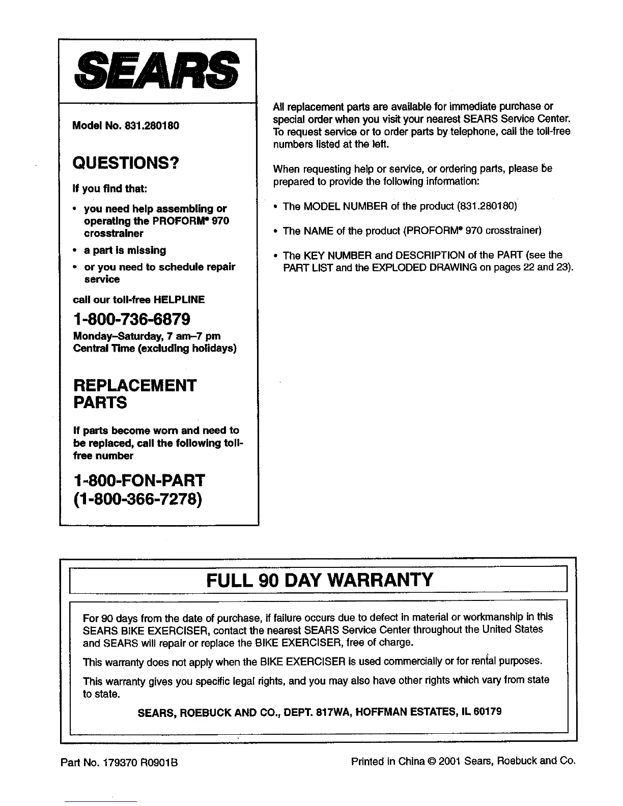 Part No. 179370 R0901B Printed in China © 2001 Sears, Roebuck and Co.