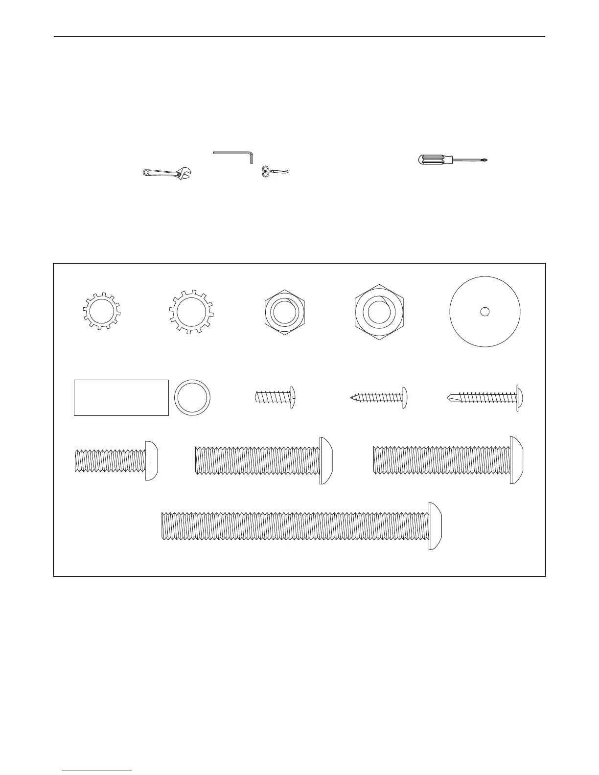 Use the drawings below to identify the assembly hardware. The number in parentheses below each drawing is