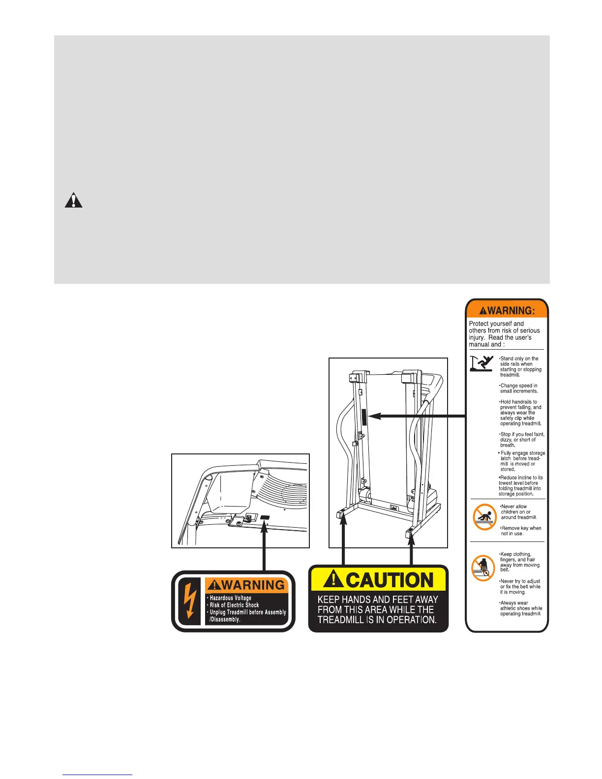 The decals shown here have been placed on your treadmill. If a decal is missing, or