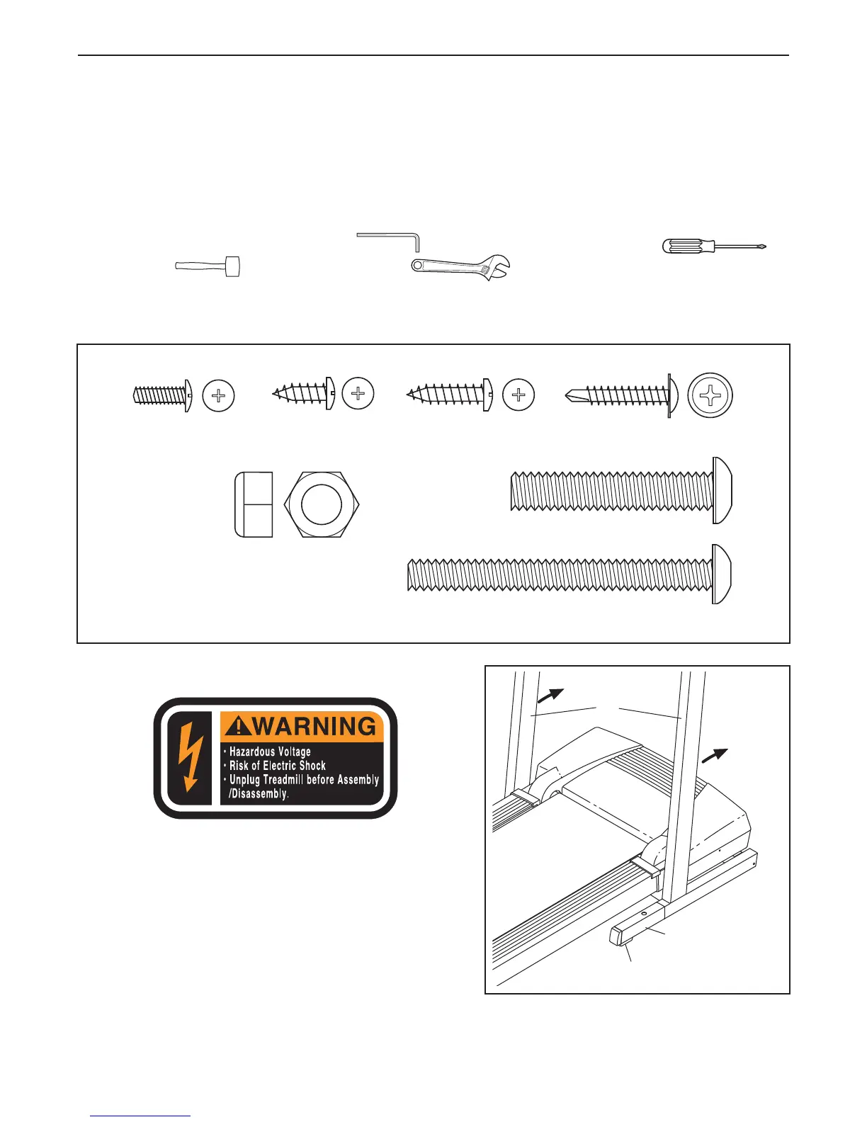 Assembly requires two persons. Set the treadmill in a cleared area and remove all packing materials. Do not