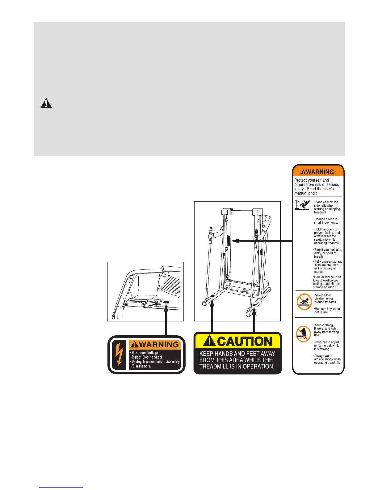 The decals shown have been placed on your treadmill. If a decal is missing, or if it