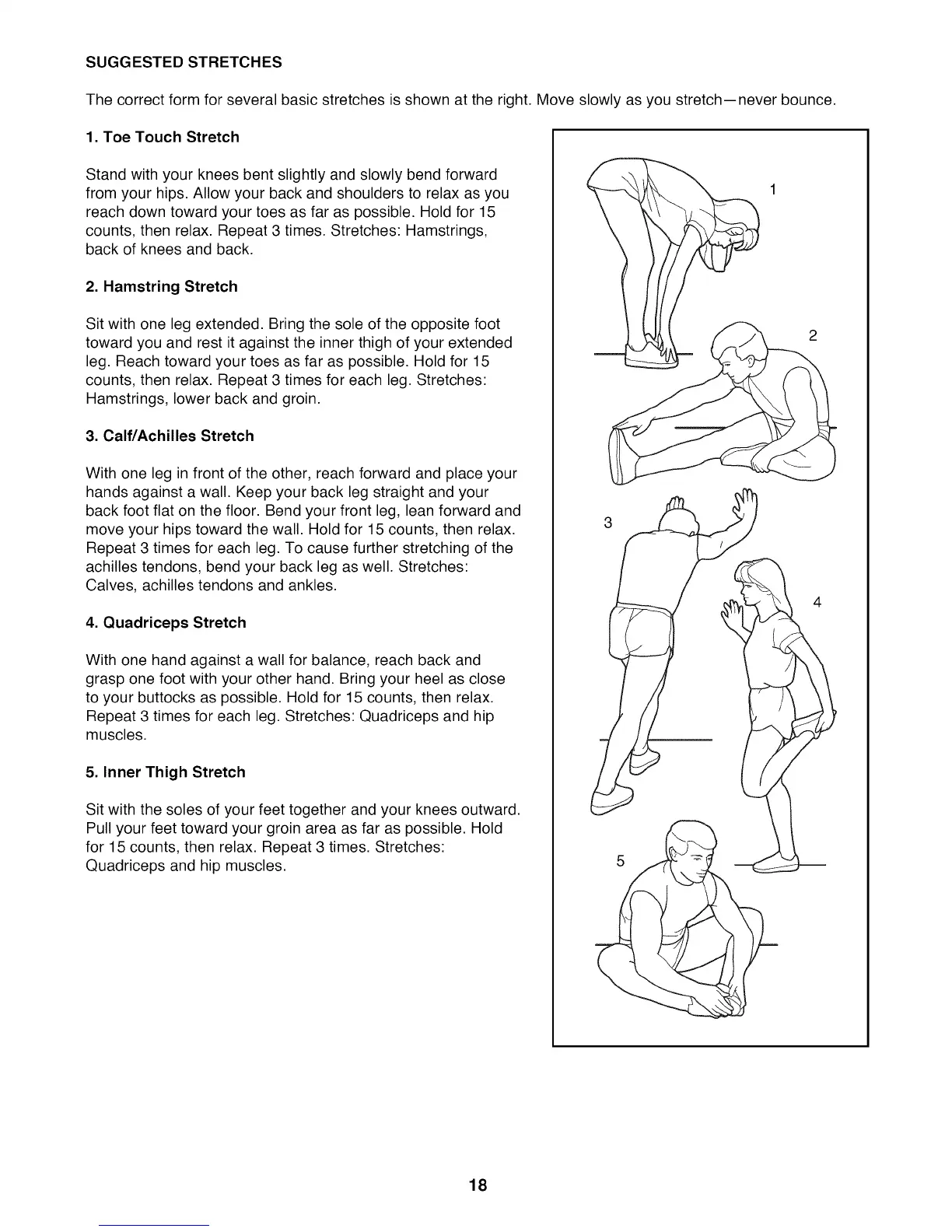 The correct form for several basic stretches is shown at the right. Move slowly as you stretch--never bounce.
