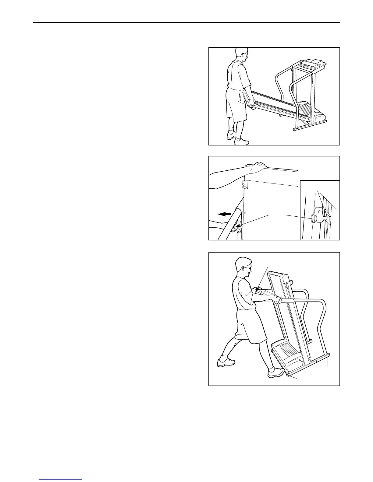 and hold it. Pivot the treadmill down until the frame is past the pin on the latch knob. Note: You may need to