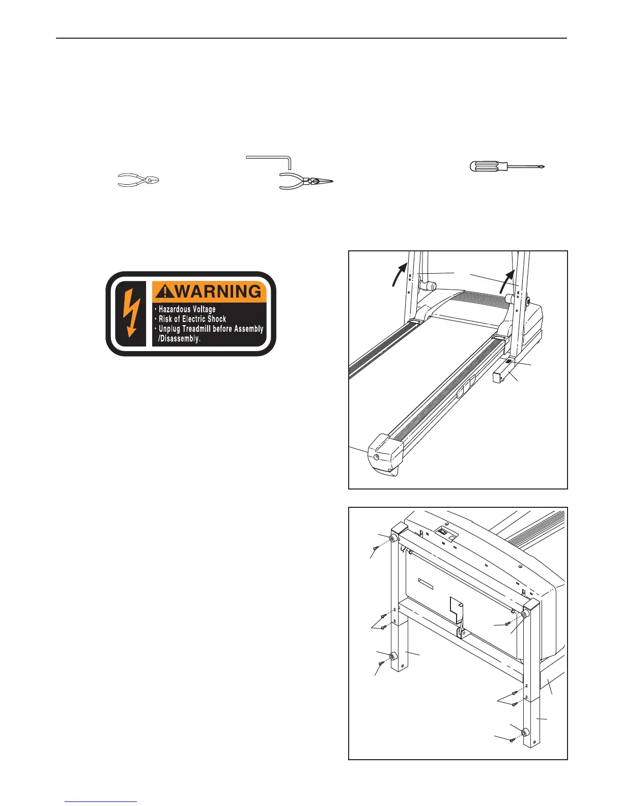 Assembly requires two persons. Set the treadmill in a cleared area and remove all packing materials. Do not