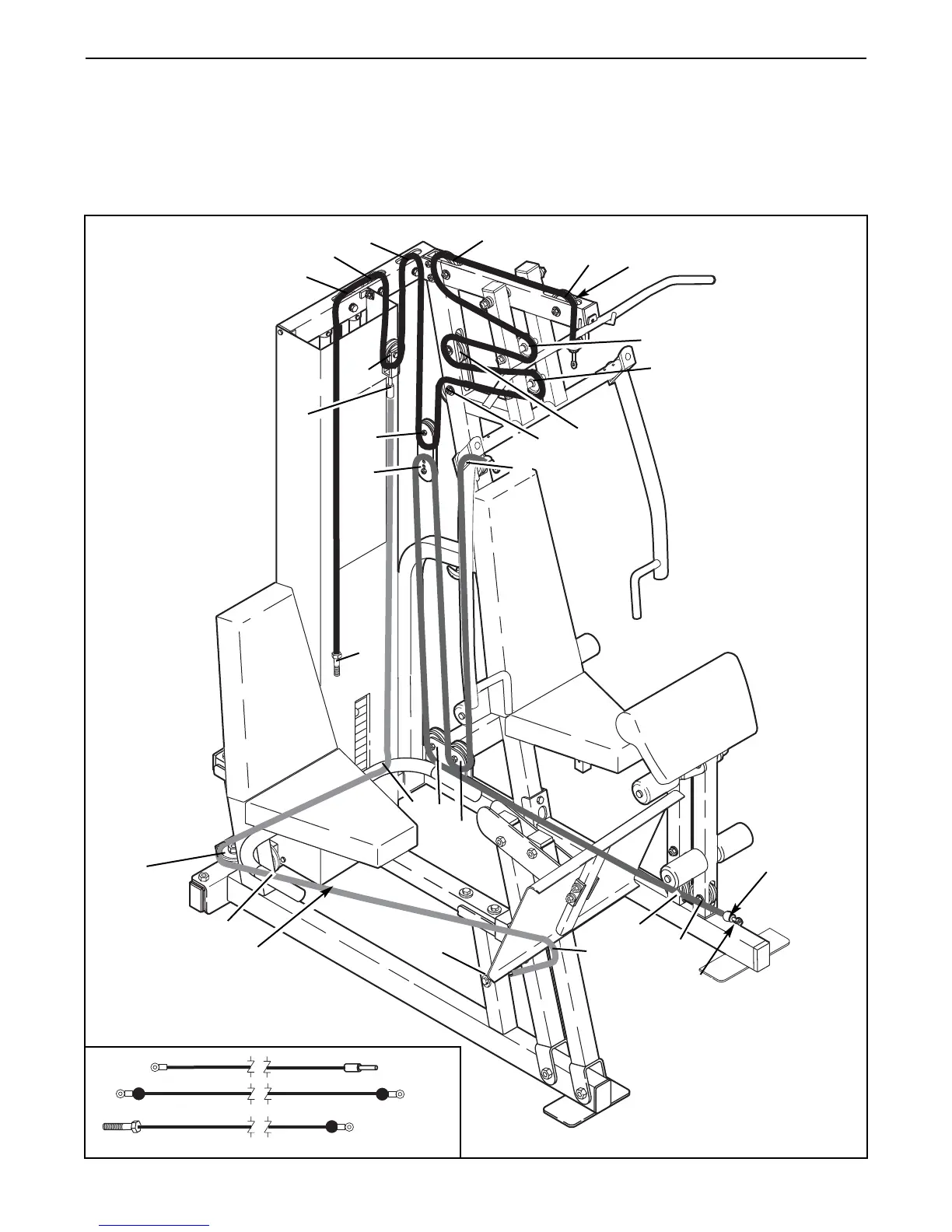 The diagram below shows the proper routing of the Low Cable (72), the High Cable (73), and the Leg Press