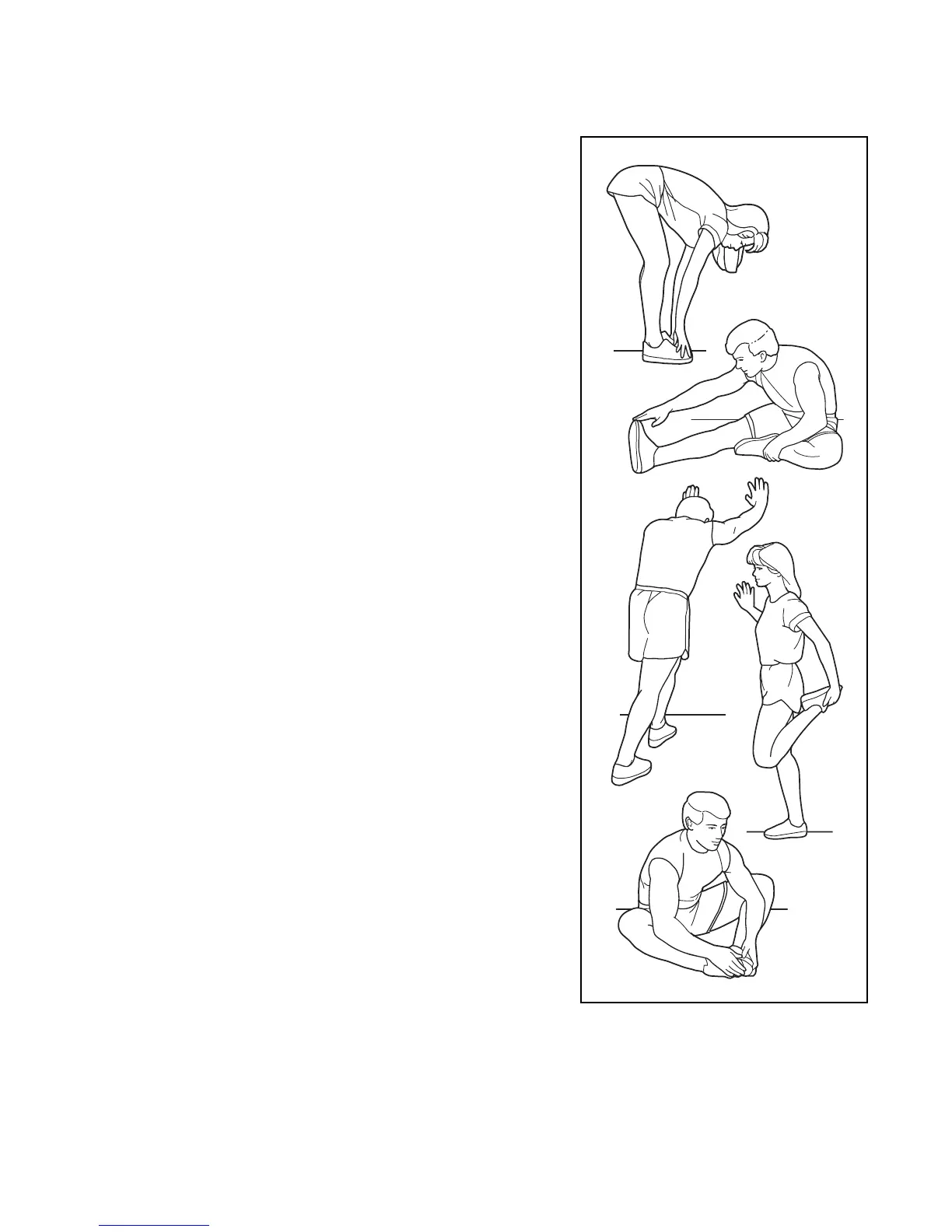 The correct form for several basic stretches is shown at the right. Move slowly as you stretch—never bounce.