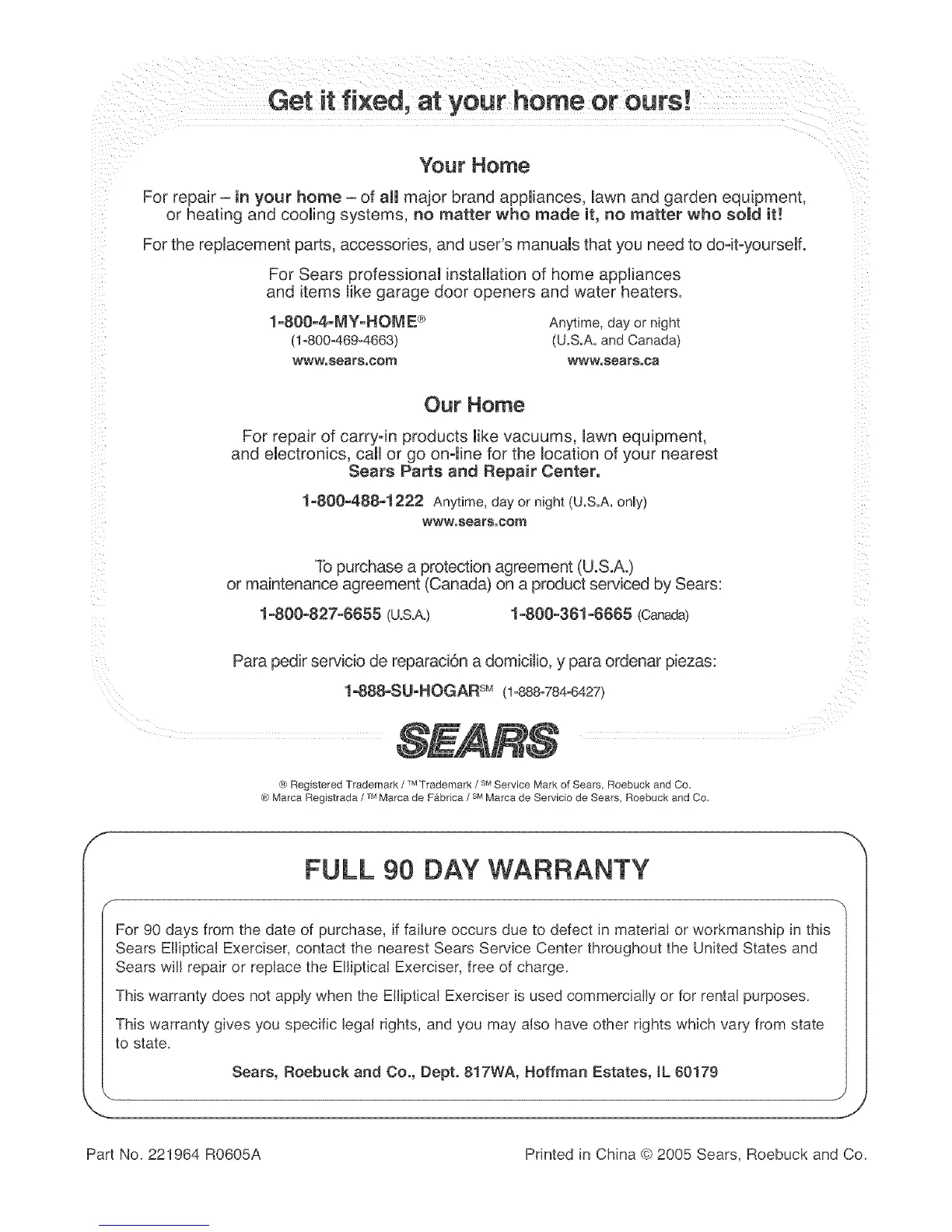 Sears Elliptical Exerciser, contact the nearest Sears Service Center throughout the United States and