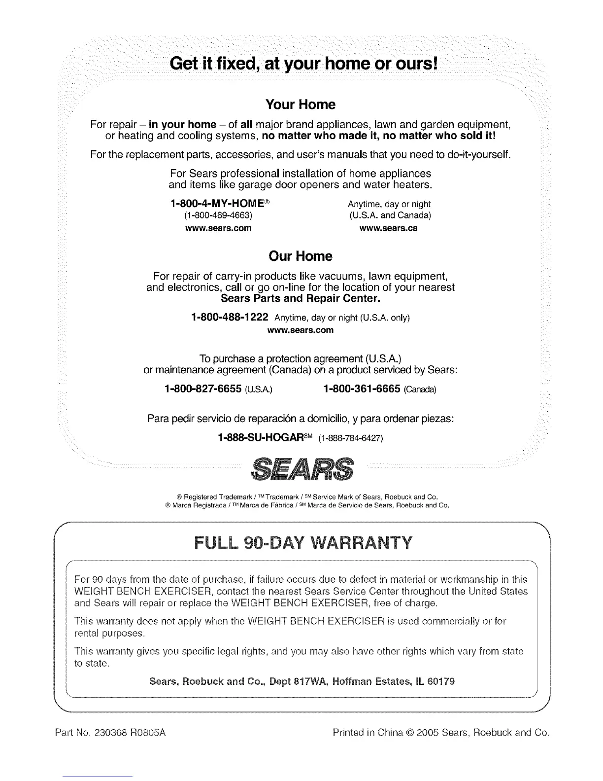 Part No, 230368 RO805A Printed in China © 2005 Sears, Roebuck and Co,