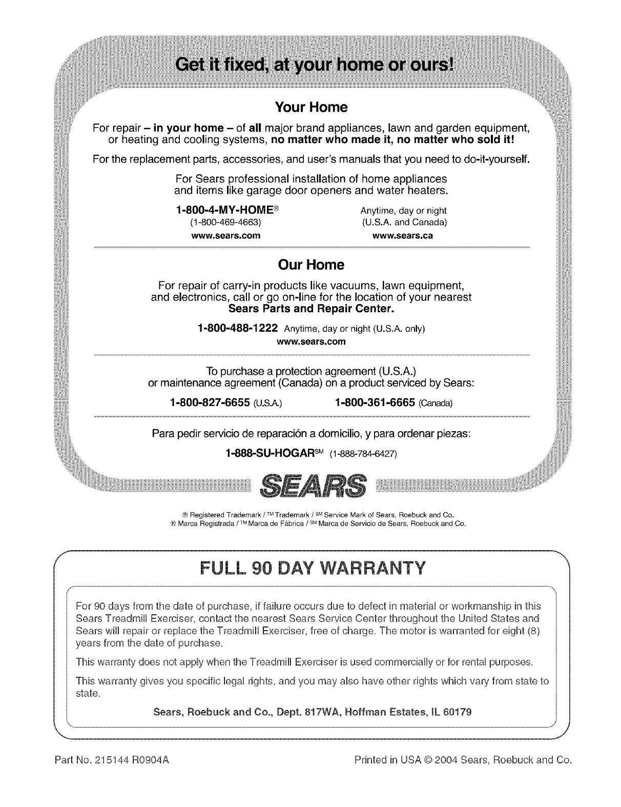 Sears TreadmHUExerciser, contact the nearest Sears Service Center throughout the United States and