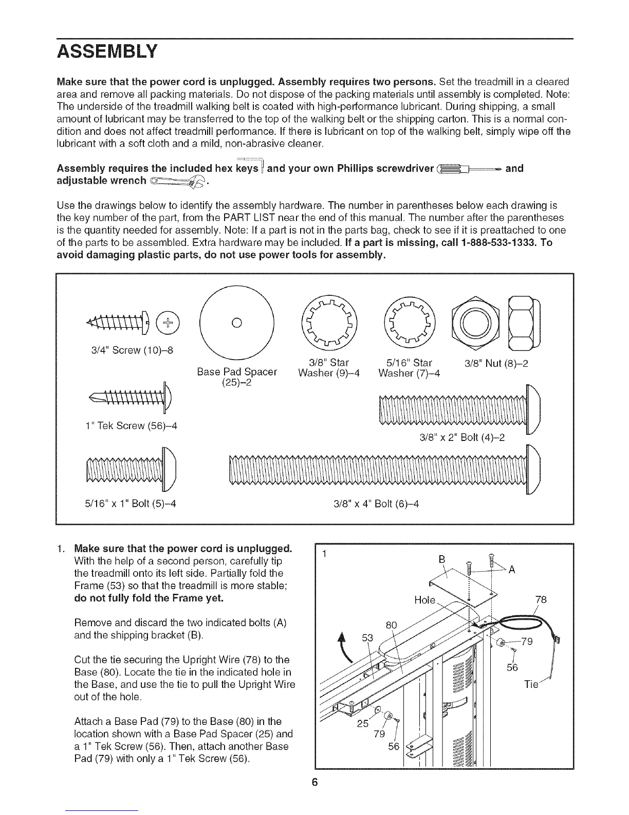 Make sure that the power cord is unplugged. Assembly requires two persons. Set the treadmill in a cleared