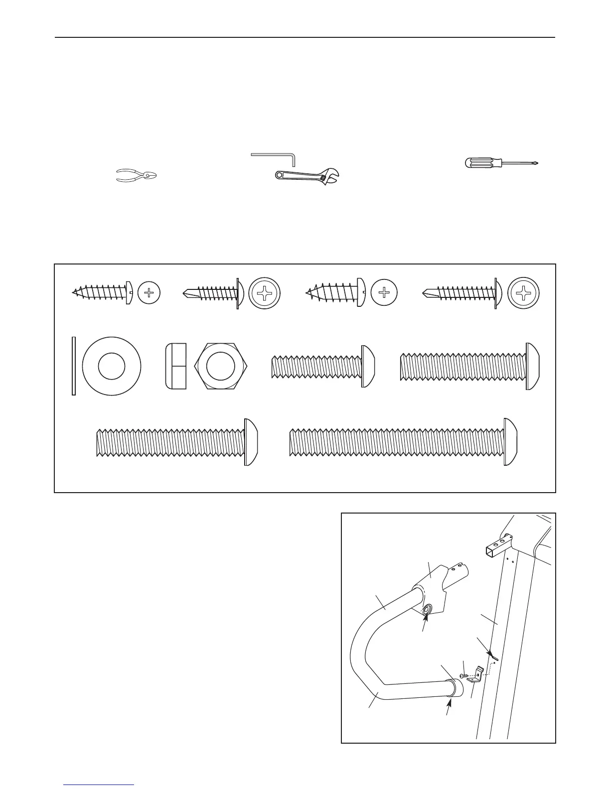 Use the drawings below to identify the assembly hardware. The number in parentheses below each drawing is