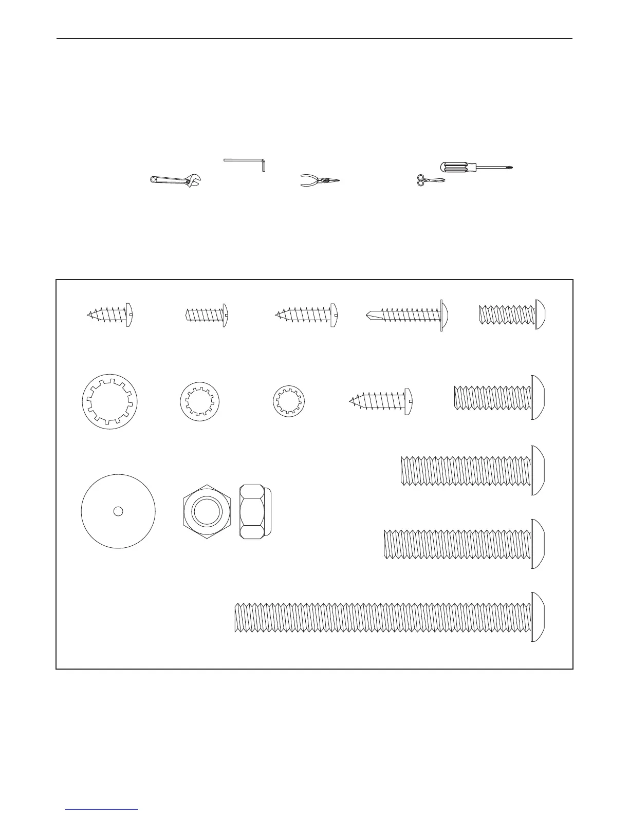 Use the drawings below to identify the assembly hardware. The number in parentheses below each drawing is