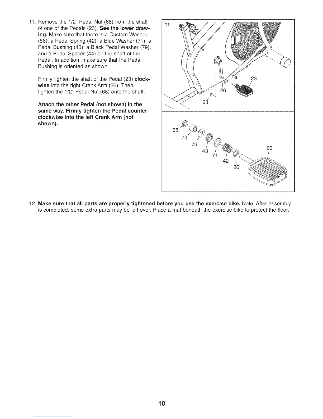 12. Make sure that all parts are properly tightened before you use the exercise bike. Note: After assembly