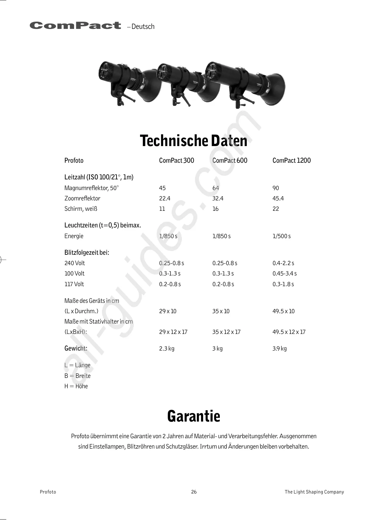 Profoto übernimmteine Garantie von 2 Jahren auf Material-undVerarbeitungsfehler.Ausgenommen