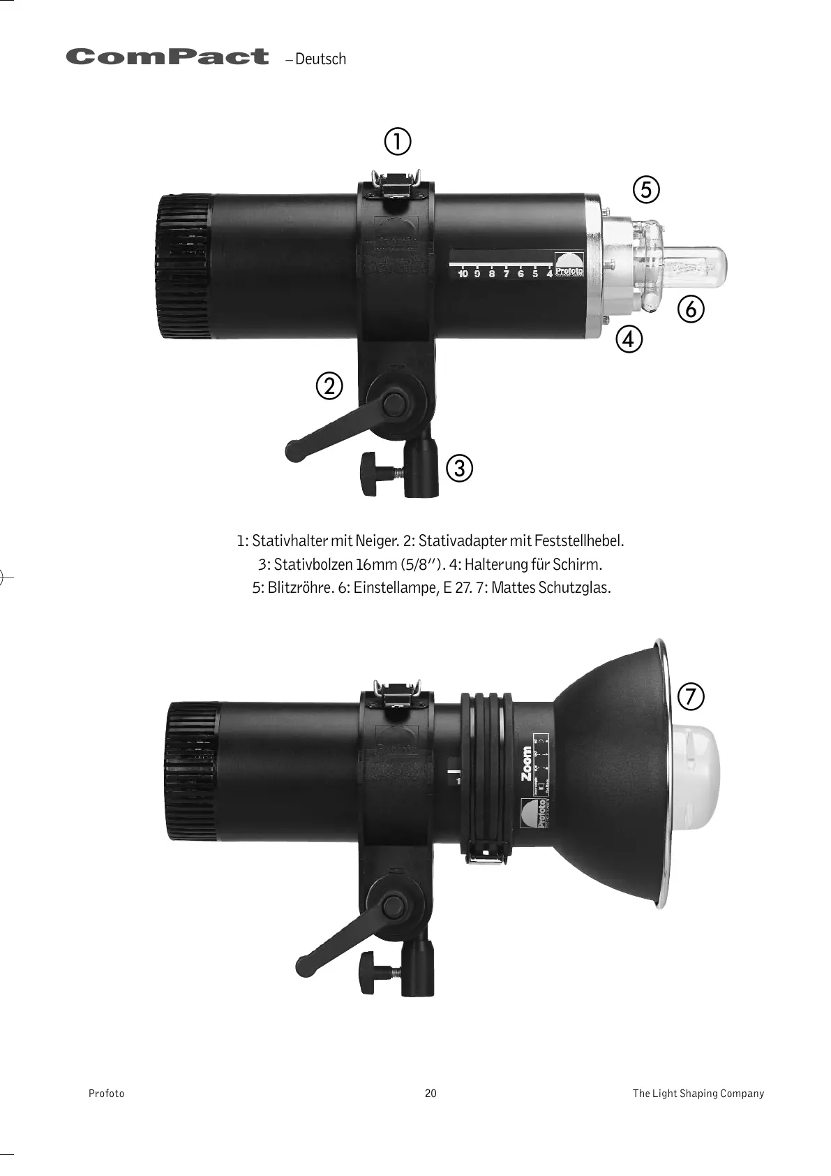 5: Blitzröhre. 6: Einstellampe, E 27.7: Mattes Schutzglas.