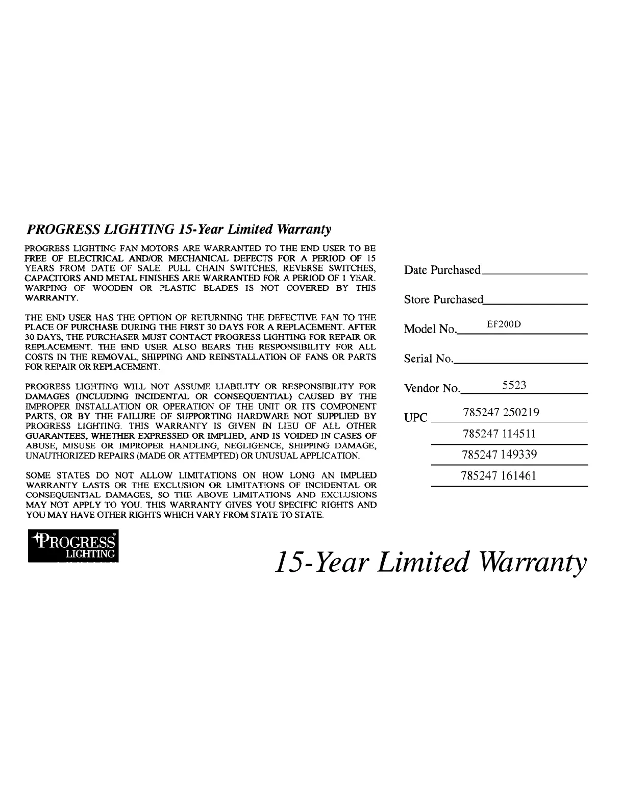 Progress Lighting EF200D - 15-Year Limited Warranty