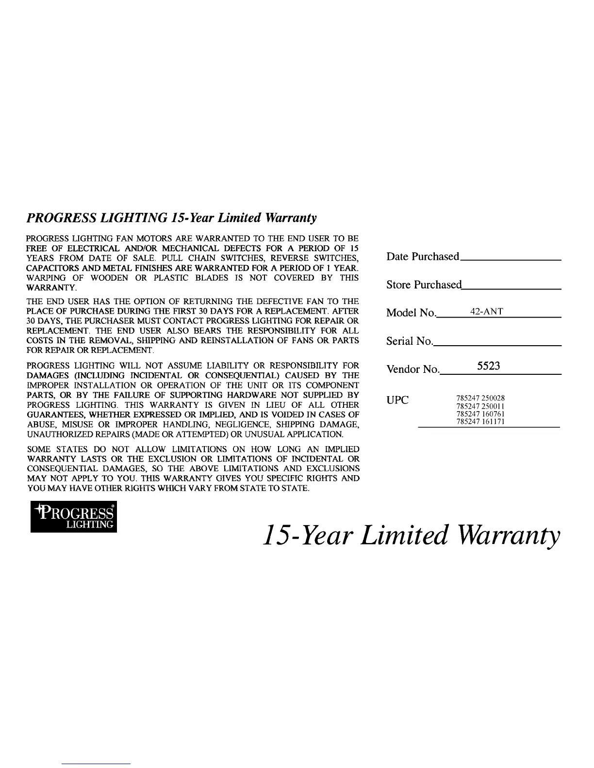 Progress Lighting P2500 - Progress Lighting 15-Year Limited Warranty