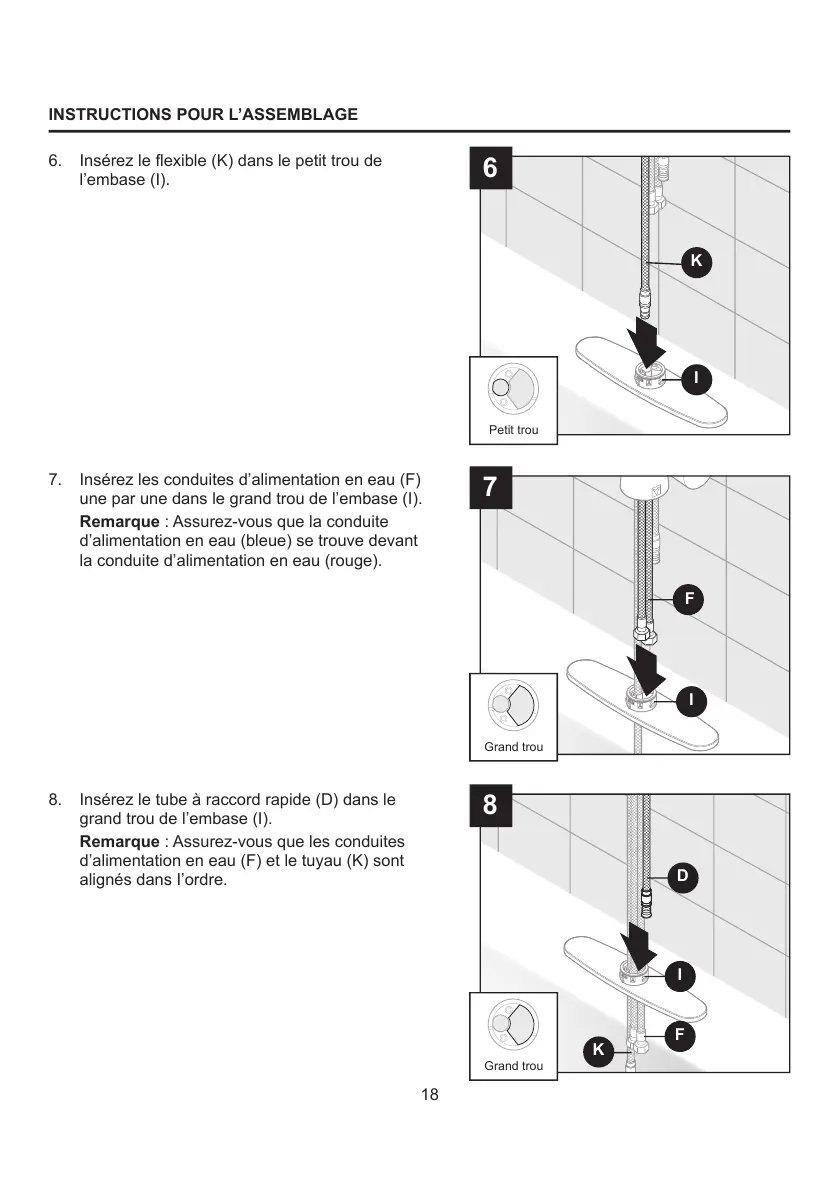 7. Insérez les conduites d’alimentation en eau (F)