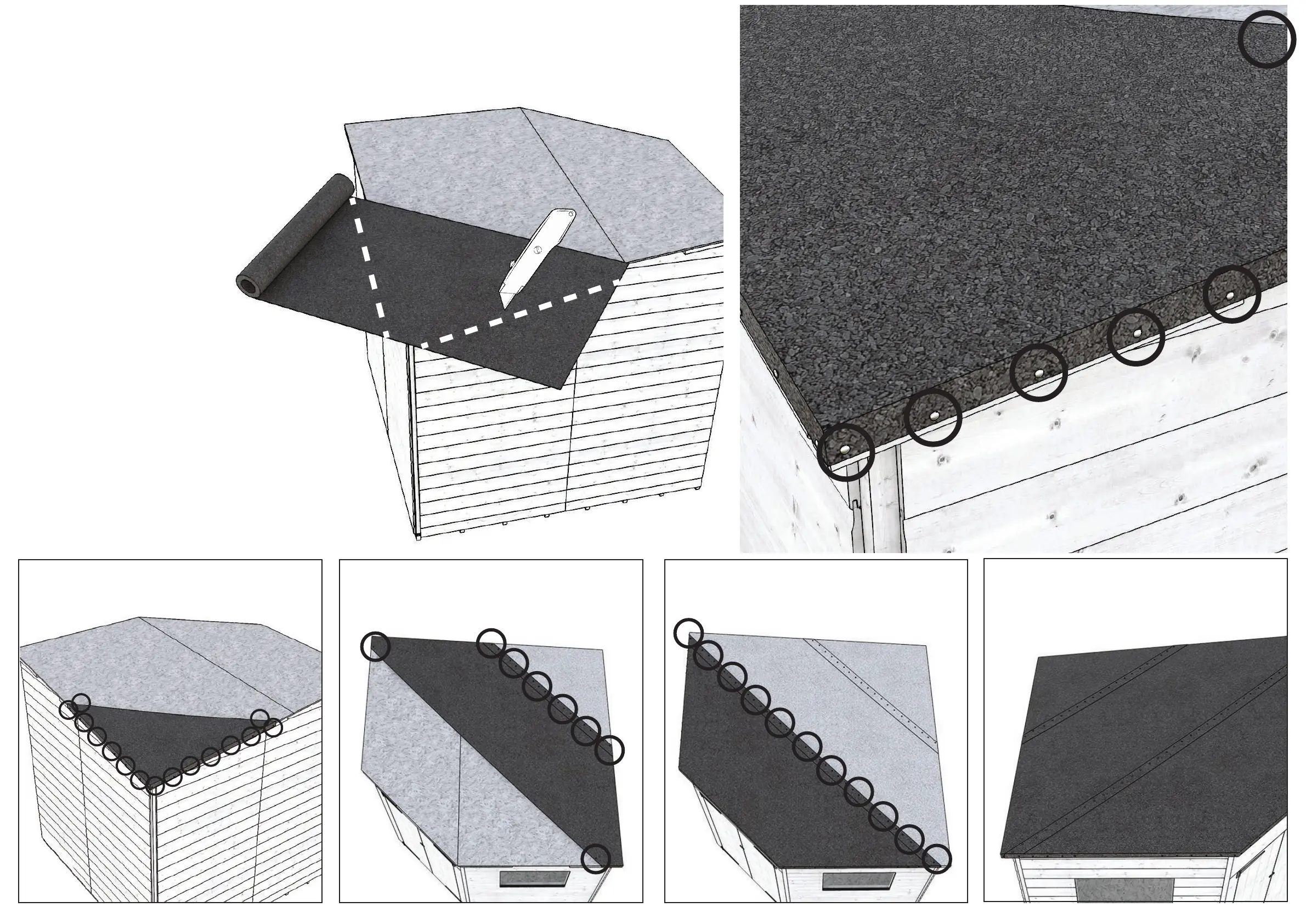 Project Timber Corner Shed - 16. Measure and Cut 3 Lengths of Felt to be Roof Length + 140 Mm; 17. Fit 1 St Felt Strip; 18. Fit 2 Nd Felt Strip; 19. Fit the 3 Rd Felt Strip