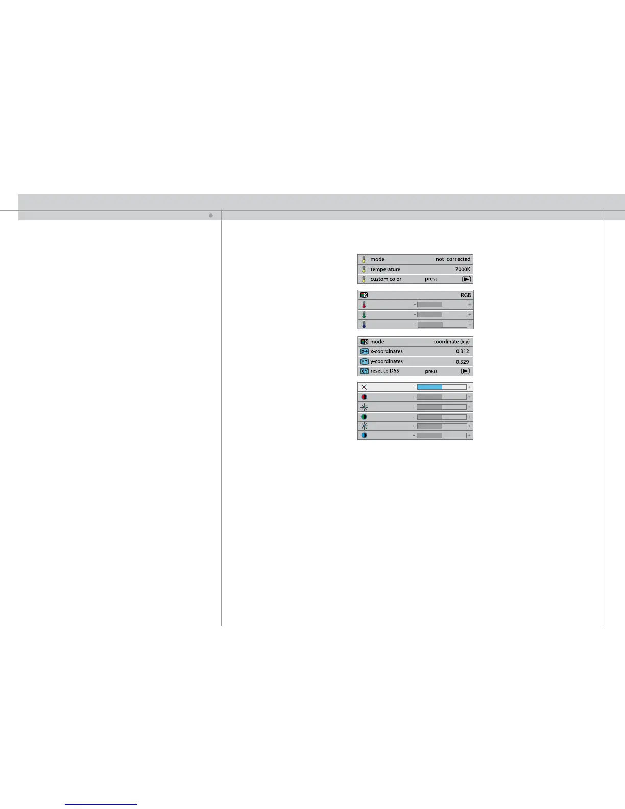 Set x and y color space coordinates directly. You may also reset to standard D65