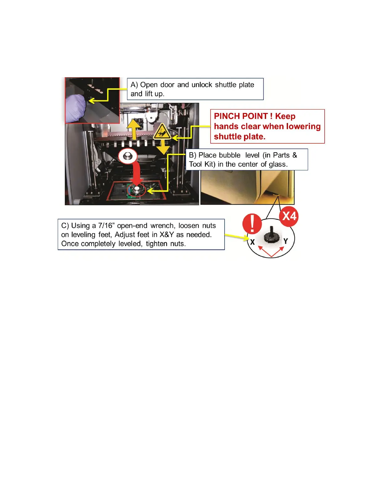 It is very important that the printer is completely leveled to ensure good part quality. Ensure the work table is sturdy and does not allow