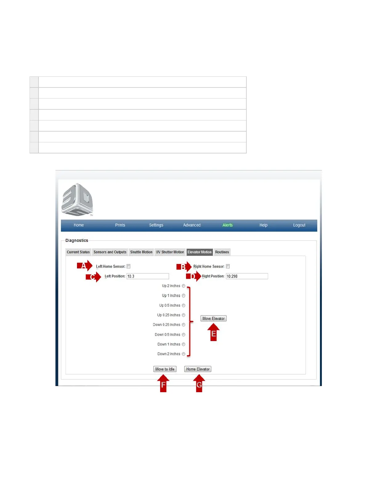On the "Home" page, click on "Advanced" and select "Diagnostic" in the drop down menu to view "Elevator Motion" screen.