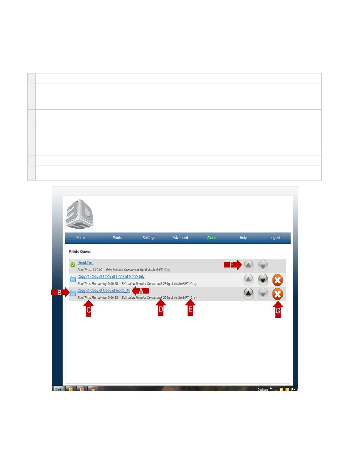 G Up\Down arrows allow for prints to be prioritized in the queue. Note: that a print that has already started may not be moved.