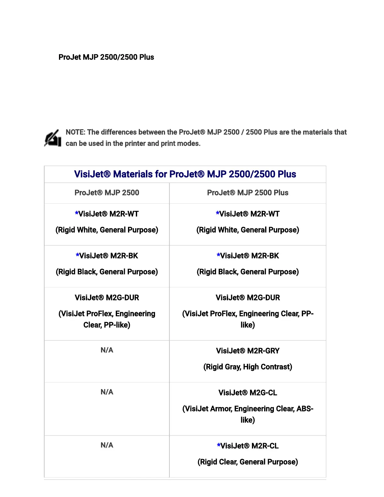 NOTE: Thedifferences between the ProJet® MJP 2500 / 2500 Plus arethe materials that