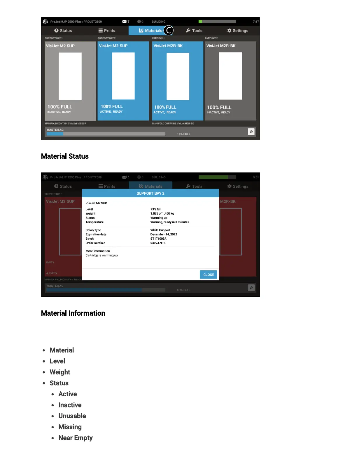 Material Status -Displays the level of material in both the Support and Part Cartridges.