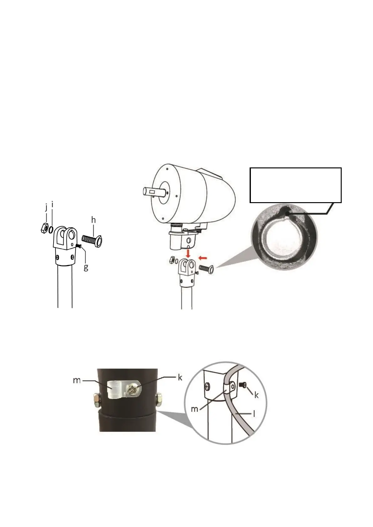 3. Lossa kabelklämskruven (k) på motoranslutningen. Placera strömkabeln (l) genom kabelklämman (m). Sätt