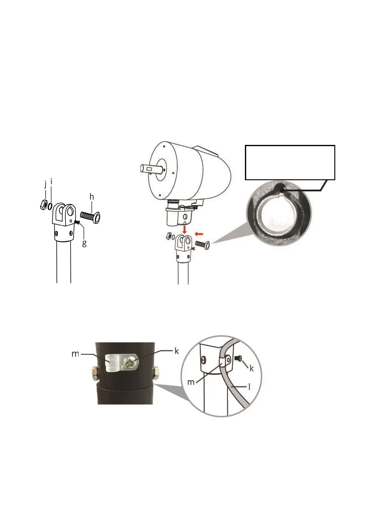 3. Vabastage mootori ühendusosa juhtmeklambri kruvi (k). Pange toitejuhe (l) läbi juhtmeklambri (m). Seejärel