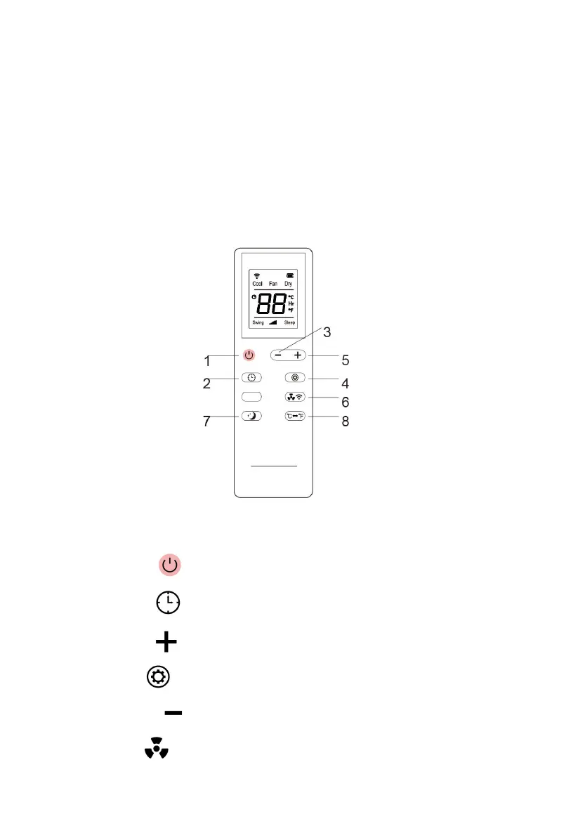 4.Läge: Tryck på för att växla läge för kylning, fläkt ochavfuktning.