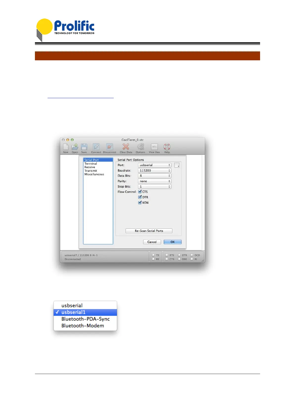 to select ‘usbserial’. Set the desired baud rate and other port settings. Click OK and click