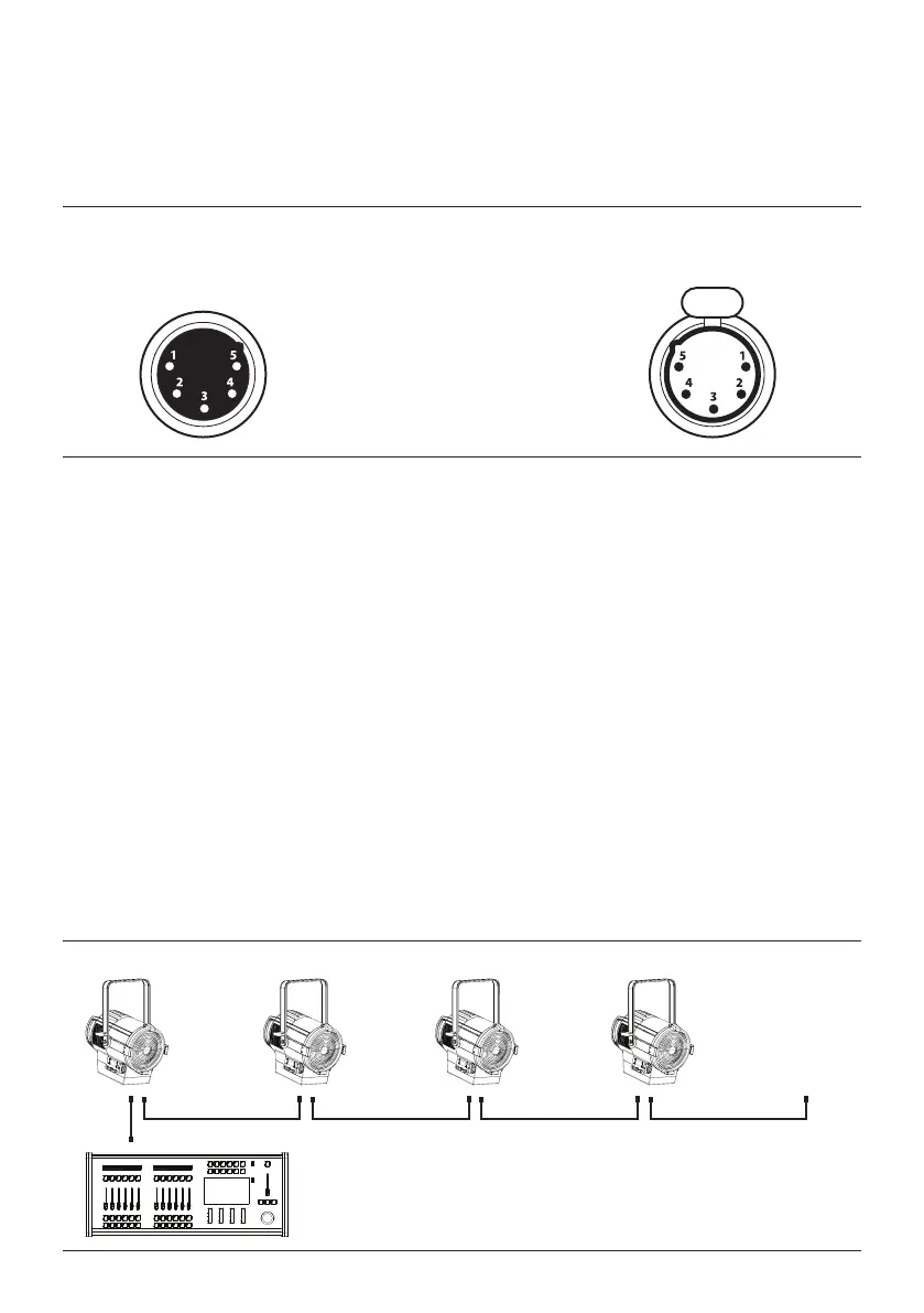 DMX connection employs standard XLR connectors. Use shielded pair-twisted cables with 120Ω im-