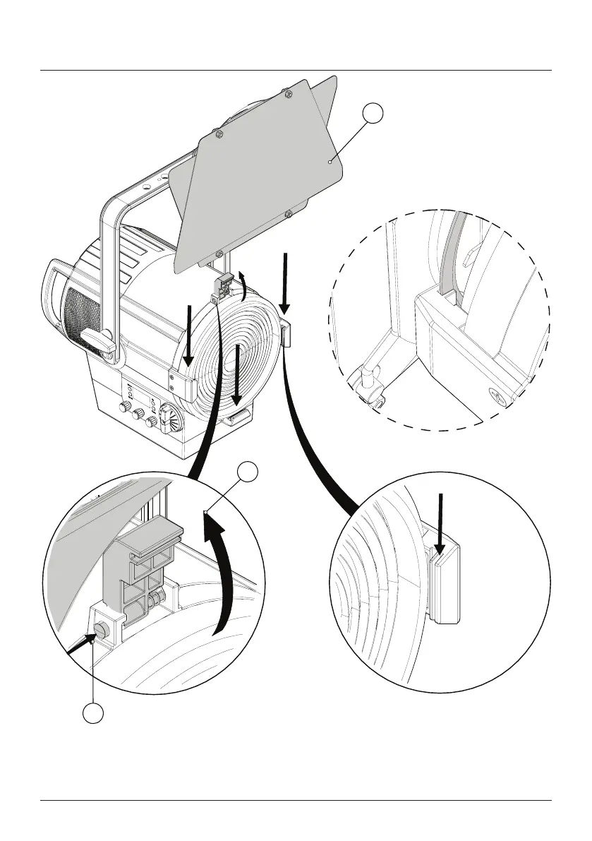 Press the pin (1) and the snap will automatically open upwards (2). Insert the barn door (3) into the gel frame