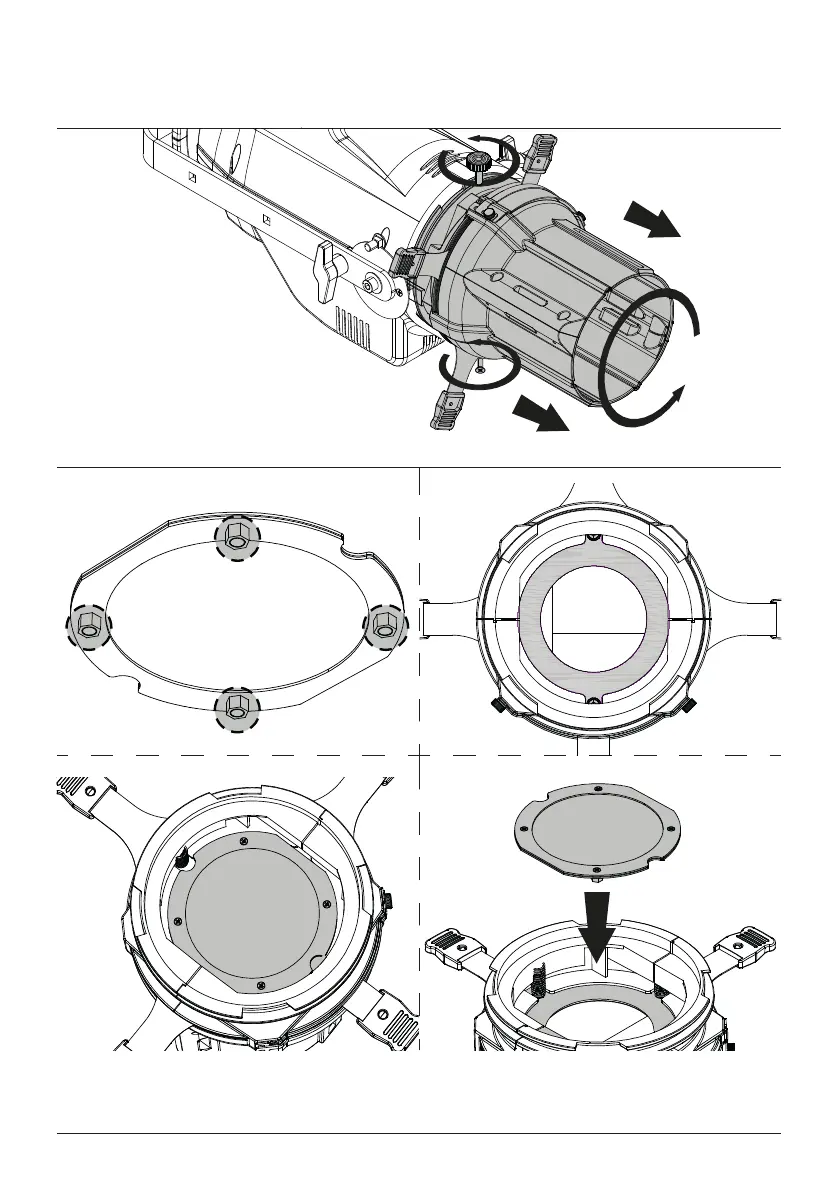 1. Loosen the marked knob and screw. Then rotate the middle part and remove it.