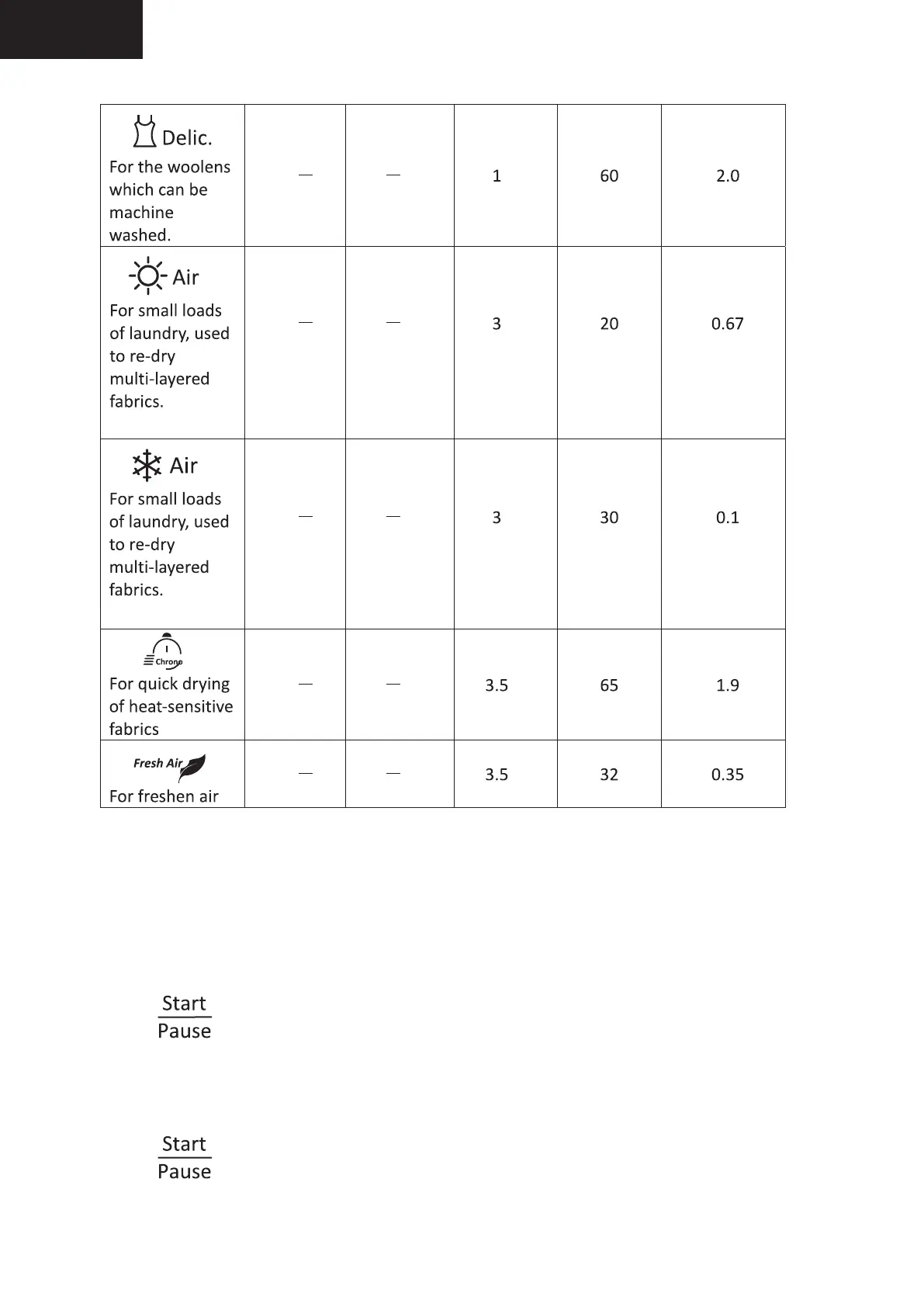 Proline PCD 8 ELECTRO - Programme Chart - Additional Cycles; Delicates and Woollens Programme; Air Programmes (Warm;Cool); Chrono and Fresh Air Programmes