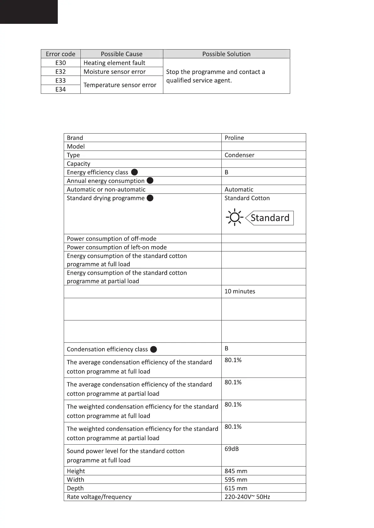 Proline PCD 8 ELECTRO - Error Messages; E30 Heating Element Fault; E32 Moisture Sensor Error; E33 Temperature Sensor Error