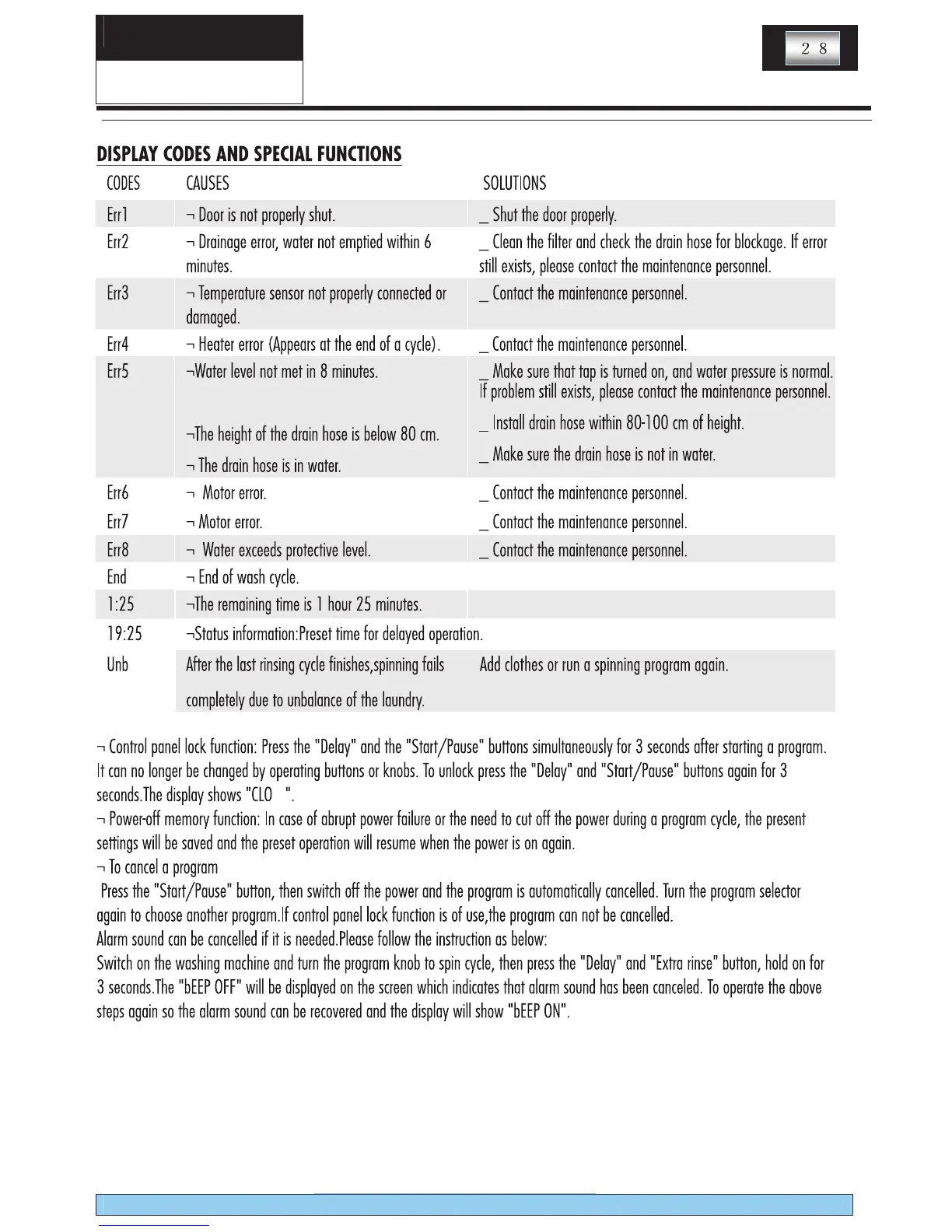 Proline PFL612W-U - Display Codes, Special Functions, and Alarms; Error Code Troubleshooting