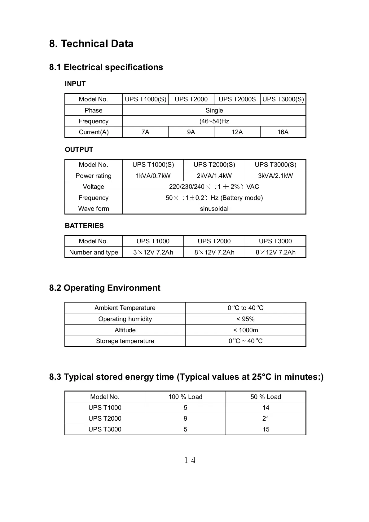 Proline UPS T1000 - Technical Data; Electrical Specifications; Operating Environment; Typical Stored Energy Time (Typical Values at 25°Cin Minutes:)