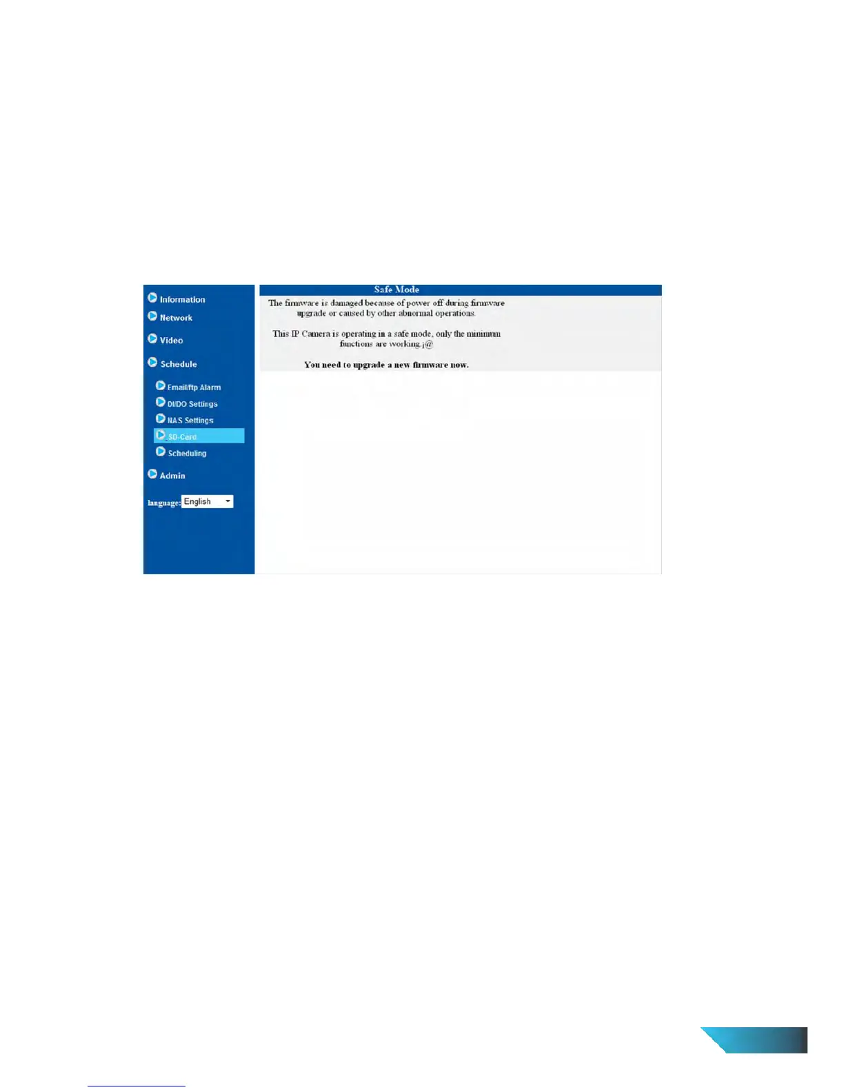 the IP Camera will enter into the safe mode. In this mode, you will see the following “Safe mode” page when