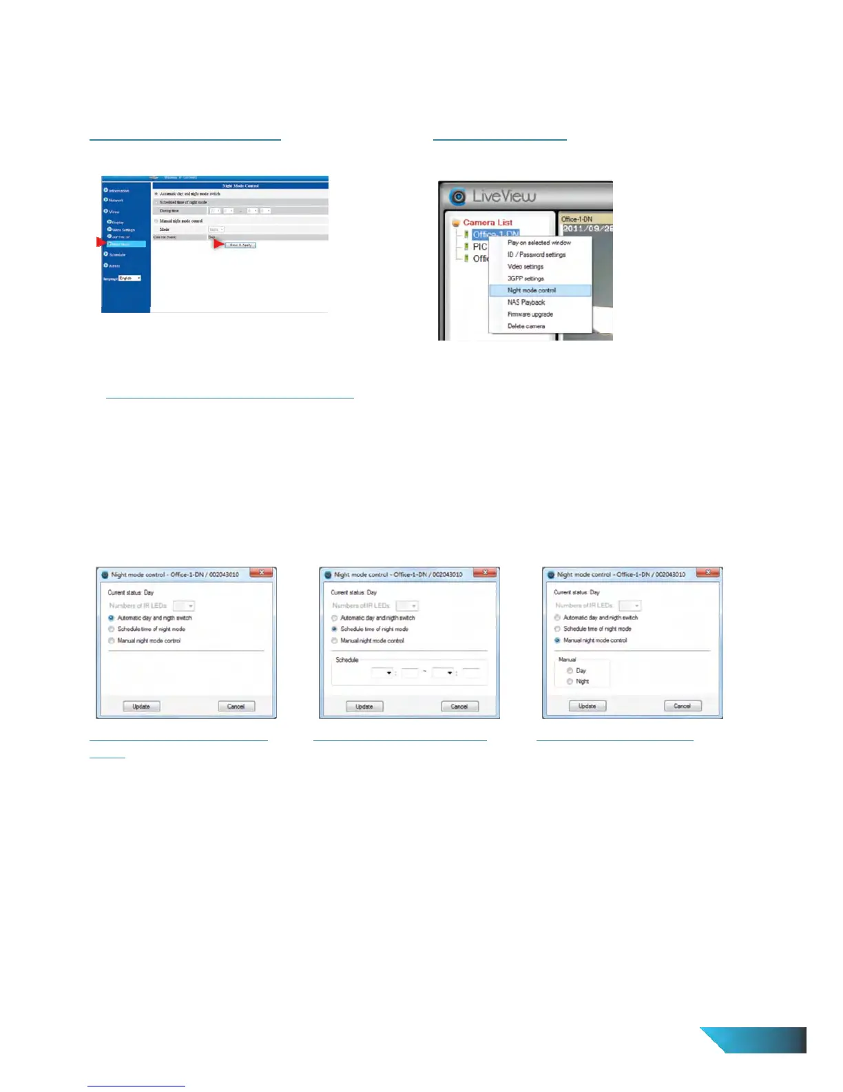 The IP Camera can be manually forced to night mode (IR LEDs on) or day mode (IR LEDs off).