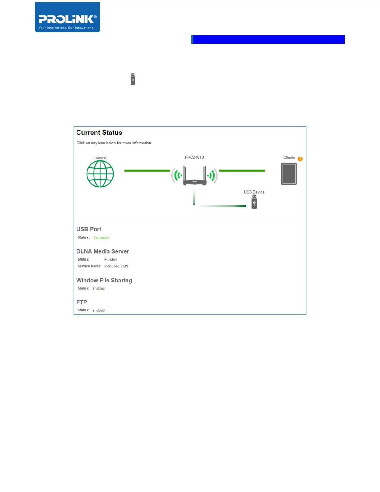 Application consists Status of USB port, DLNA Media Server, Window File Sharing (SAMBA) and