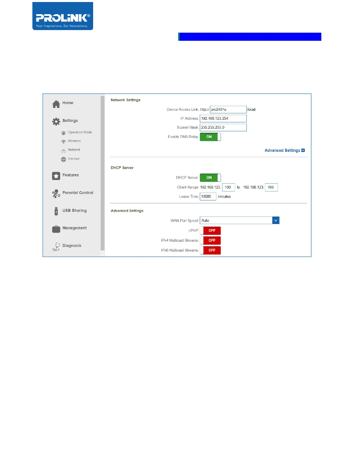 • Lease Time: Set the duration of time for the IP Address lease. The value is in minutes.