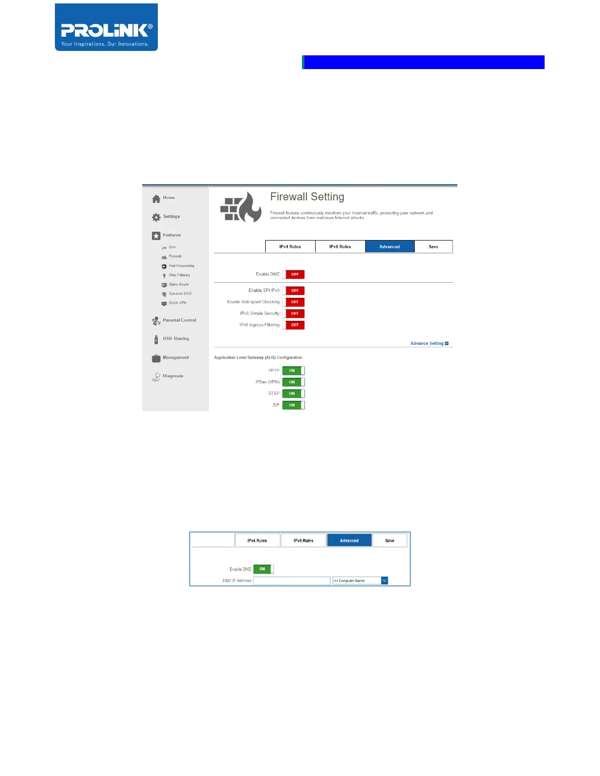 • Enable DMZ: Enable and disable DMZ. Enable this feature will expose a single computer to